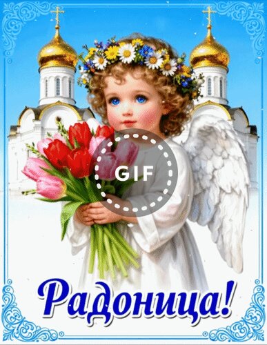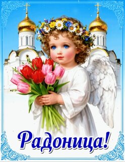 Красивая поздравительная открытка к празднику Радоница. На изображении миловидный ангел с голубыми глазами и венком из полевых цветов, держащий пышный букет красных и розовых тюльпанов. На фоне виднеются золотые купола православного храма под ясным небом. Изображение наполнено светом и нежностью, идеально подходит для духовного поздравления близких и друзей в день поминовения усопших.