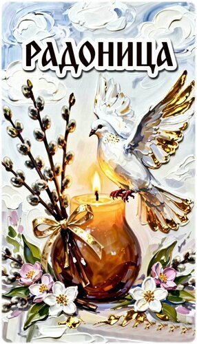 Художественная иллюстрация, посвященная празднику Радоница. На композиции изображена белая голубка с золотистыми крыльями, символизирующая чистоту и светлую память. Рядом с птицей стоит зажженная свеча в янтарном подсвечнике, излучающая мягкое тепло. Композицию дополняют весенние вербы с пушистыми почками и нежные цветущие ветви, создающие атмосферу весеннего возрождения и духовного покоя. Изображение выполнено в технике импасто с выразительными мазками масляной краски, сочетая светлые небесные тона с теплыми золотистыми оттенками.