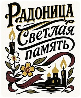 Графическая иллюстрация к празднику Радоница, выполненная в стилизованном стиле с использованием контрастных цветов (черный, золотистый, белый). На изображении присутствуют символы вечной памяти и духовности: зажженные свечи, распускающиеся цветы, ленты и силуэт православного храма на фоне воды. Текст на русском языке «Радоница. Светлая память» выполнен каллиграфическим шрифтом, подчеркивающим торжественность и мемориальный характер события. Изображение передает атмосферу светлой скорби, почитания усопших и духовного единения.