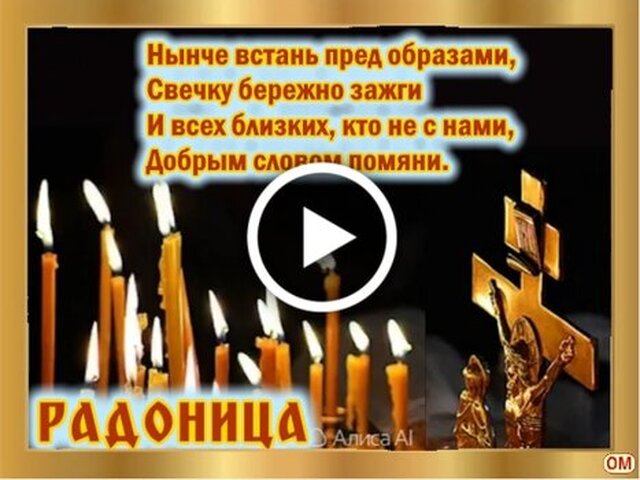 Видео посвящено православной традиции поминовения усопших в день Радоницы. Визуальный ряд представляет собой торжественную и спокойную сцену с горящими церковными свечами на темном фоне и православным крестом. На экране отображается текст на старославянском языке, призывающий встать перед образами, зажечь свечу и добрым словом помянуть всех близких, которых больше нет с нами. Это видео служит духовным напоминанием о важности молитвы и памяти о предках в этот светлый день.