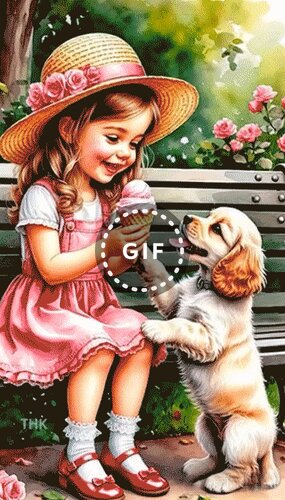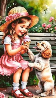 Милая и трогательная иллюстрация в пастельных тонах, изображающая маленькую девочку в розовом платье и широкополой шляпе, которая делится мороженым со своим маленьким щенком. Сцена происходит на улице в солнечном саду, окруженном розами. Изображение наполнено нежностью, детской радостью и узами дружбы между ребенком и питомцем. Идеально подходит для использования в качестве открытки, декора для детской комнаты или в тематике «милые животные и дети».