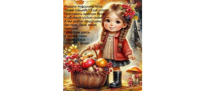 Теги:решили пофорсить пока зачем спешить ещё успеют подставить зимушке бока, чтоб грела шубою своею а мы охотно пошуршим листвою день такой погожий побродим здесь, в лесной тиши, сказав за всё - спасибо, боже