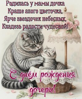Открытка с милыми котятами: взрослая серая полосатая кошка нежно смотрит на маленького котенка, сидящего в корзинке. На фоне — изящная лампа с цветами и розами. На изображении наложен красивый текст на русском языке: трогательное стихотворение о рождении дочери и поздравление «С днём рождения, дочери!». Идеально подходит для поздравления детей и близких людей в социальных сетях.