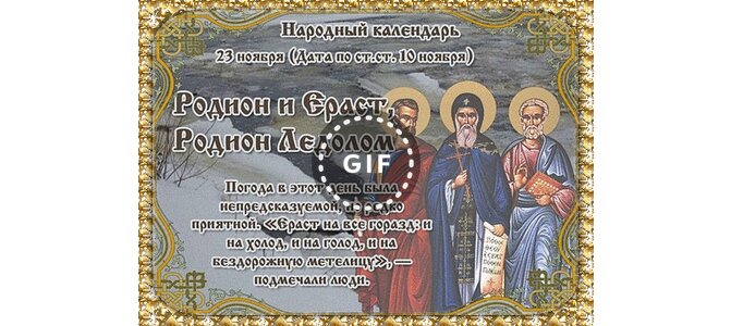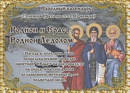 Народный календарь 23 ноября (Дата по ст. ст. 10 ноября) Родион и Сраст, Родион Ледолом. Погода в этот день была непредсказуемой, но редко приятной. «Ераст на все гораздо и на холод, и на голод, и на бездорожную метелицу», подмечали люди.