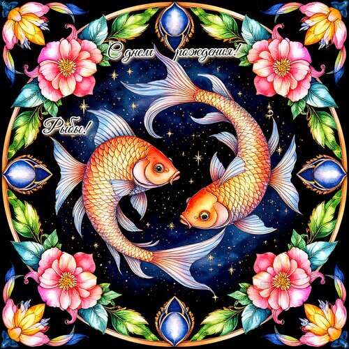 Красочная поздравительная открытка в стиле акварельной иллюстрации, посвященная дню рождения Рыб. В центре композиции изображены две золотые рыбки, плавающие по кругу на фоне глубокого синего звездного неба, что символизирует бесконечность и гармонию. Изображение обрамлено изысканным золотым венком из пышных розовых цветов и сочных зеленых листьев. На картинке присутствует изящная надпись на русском языке: «С днем рождения, Рыбы!». Иллюстрация наполнена волшебной атмосферой, мерцанием звезд и яркими цветами, идеально подходящая для поздравления людей, родившихся под знаком зодиака Рыбы.