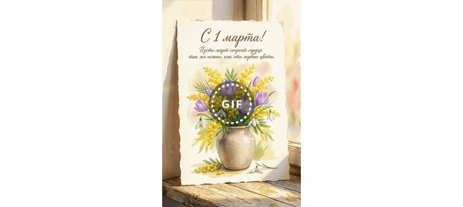 Анимированная открытка "С 1 Марта! Пусть Март согреет сердце так же нежно, как эти первые цветы"