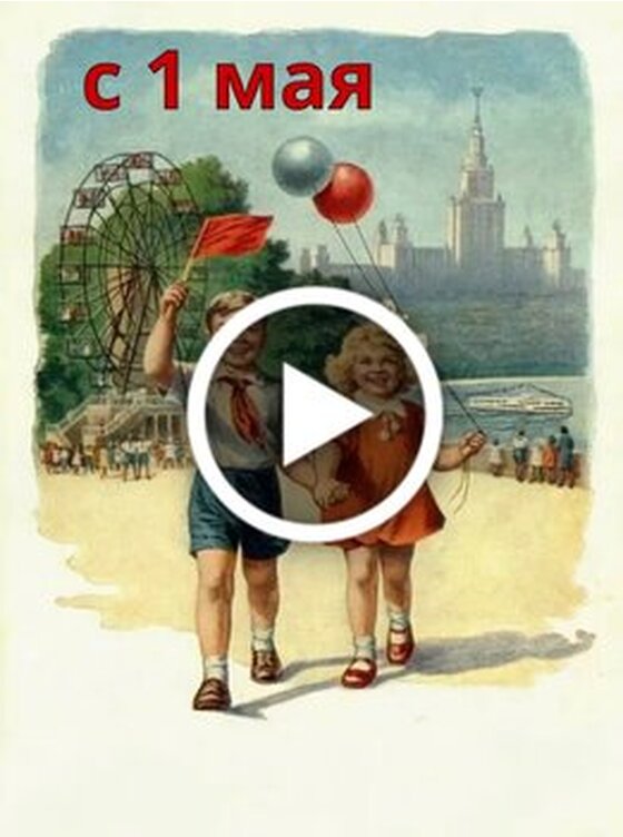 Поздравление с Первым мая в стиле советской ретро открытки. На видео изображены двое улыбающихся детей мальчика и девочка которые идут за руку по набережной. Мальчик держит в руке красный флаг а девочка держит связку воздушных шаров. На заднем плане виден парк аттракционов с колесом обозрения и величественное здание в архитектурном стиле сталинского ампира. Видео передает атмосферу праздника радости и ностальгии по советскому детству. Это идеальное визуальное поздравление с праздником весны и труда.