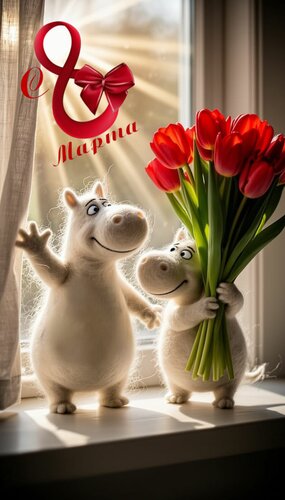 Бегемотик поздравляет подружку букетом тюльпанов