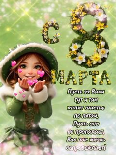 С 8 Марта! Пусть за вами тут и там Ходит счастье по пятам Пусть оно не пропадает........