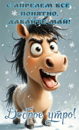 Забавная и позитивная цифровая иллюстрация с мультяшным конем для поздравления с началом мая. На картинке изображен эмоциональный конь с широкой улыбкой на фоне падающего снега. Сверху расположена шутливая надпись на русском языке: «С апрелем всё понятно, давайте май!», а снизу — пожелание «Доброе утро!». Изображение выполнено в ярком 3D-стиле, идеально подходит для отправки в мессенджерах (WhatsApp, Telegram) и социальных сетях в качестве весеннего настроения и юмористической открытки.