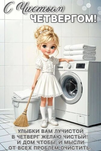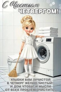 Открытка "С Чистым четвергом! Улыбки вам лучистой в четверг желаю чистый! И дом чтобы, и мысли от всех проблем очистить."