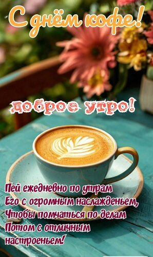 Уютное и вдохновляющее изображение для пожелания доброго утра. На переднем плане — чашка аппетитного капучино с красивым латте-артом в виде листка, стоящая на блюдце. Фон размыт, создавая атмосферу тепла: видны нежные розовые цветы (герберы) и солнечный свет. На картинке нанесен мотивирующий текст на русском языке: «С днём кофе! Доброе утро! Пей ежедневно по утрам его с огромным наслажденем, чтобы помчаться по делам потом с отличным настроеньем!» Идеально подходит для сторис, постов в соцсетях и рассылки добрых пожеланий в мессенджерах.