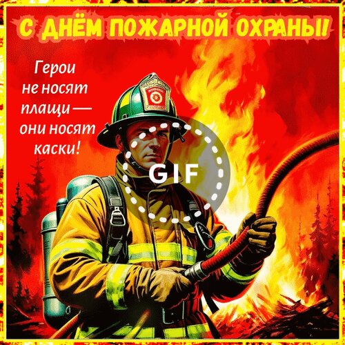 Анимированная открытка "С днём пожарной охраны! Герои не носят плащи - они носят каски!"