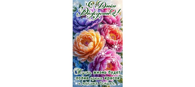 Теги:с днём рождения, женщине, цветы, пионы, зима, снег, снежинки, пожелания на каждый день, теплых в стреч, ярких красок, девушке