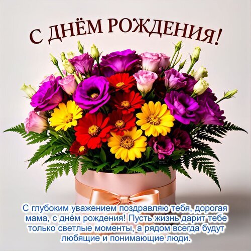 С глубоким уважением поздравляю тебя, дорогая мама, с днём рождения! Пусть жизнь дарит тебе только светлые моменты, а рядом всегда будут любящие и понимающие люди.