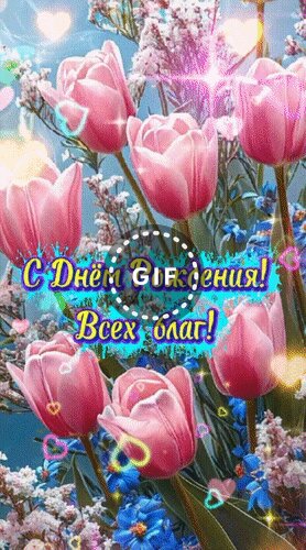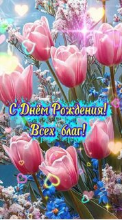 Красочная поздравительная открытка с розовыми тюльпанами для поздравления с днем рождения. Изображение наполнено нежными цветами, мерцающими искрами и романтичными сердечками. Надпись на русском языке «С днем рождения! Всех благ!» делает эту открытку идеальным цифровым подарком для близких, друзей или коллег. Яркий и эмоциональный дизайн отлично подходит для отправки в мессенджерах и социальных сетях.