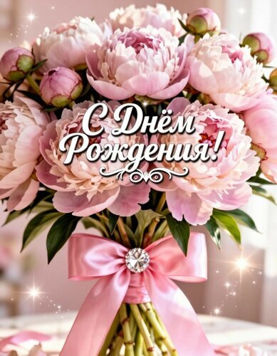 Красивая открытка с пышным букетом нежно-розовых пионов. На фоне цветущих бутонов расположена элегантная надпись на русском языке «С Днём Рождения!». Букет перевязан атласной розовой лентой с блестящей декоративной брошью в центре. Изображение наполнено мягким светом, мерцающими искрами и праздничной атмосферой. Идеально подходит для поздравления женщины, подруги, мамы или любимой с днем рождения. Подойдет для использования в качестве цифровой поздравительной открытки в социальных сетях, мессенджерах или для отправки в электронном виде.