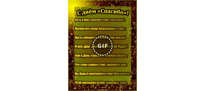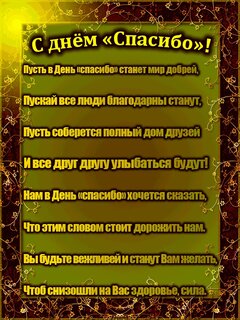 С днём "Спасибо"! Пусть в день "спасибо" станет мир добрей, пускай все люди благодарны станут, пусть соберётся полный дом друзей и все друг другу улыбаться будут! Нам в день "спасибо" хочется сказать, что этим словом стоит дорожить нам. Вы будьте вежливей и станут вам желать, чтоб снизошли на вас здоровье, сила.