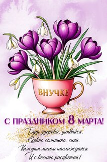 Внучке. С праздником 8 марта! Будь здорова, улыбайся, словно солнышко, сияй. Каждым мигом наслаждайся и с весною расцветай!