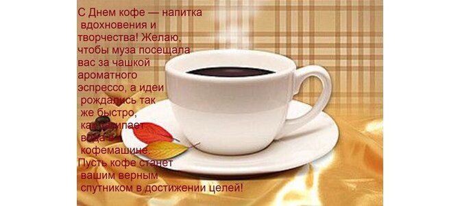 Открытка "С Днем кофе — напитка вдохновения и творчества! Желаю, чтобы муза посещала вас за чашкой ароматного"