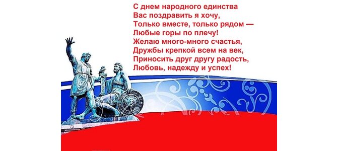 Теги:с днем народного единства вас поздравить я хочу, только вместе, только рядом любые горы по плечу желаю много-много счастья, дружбы крепкой всем на век, приносить друг другу радость, любовь, надежду и успех