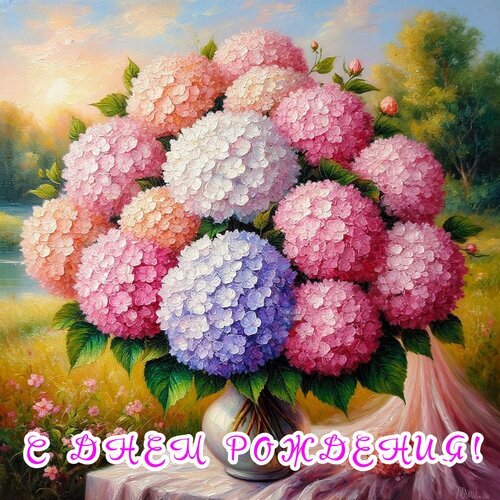 Живописный букет пышных гортензий в пастельных тонах: розового, голубого и белого цветов. Нежная акварельная или масляная стилистика с мягким освещением. Изображение украшено праздничной надписью на русском языке «С Днем рождения!», что делает его идеальным для использования в качестве поздравительной открытки, декора для социальных сетей или тематического оформления праздничного контента. Цветы расположены в изящной вазе на фоне мягкого природного пейзажа с деревьями и зеленью.