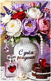 Красивая поздравительная открытка к дню рождения с роскошным букетом цветов. На изображении представлено пышное сочетание белых, розовых и фиолетовых пионов, а также глубоких красных роз и веточек лаванды. Цветы стоят в изящной белой вазе с мозаичным узором, на которой каллиграфическим шрифтом написано «С днём рождения!». Композицию дополняют эстетичные детали: флакон изысканных духов с сердечком, шоколадный торт, украшенный жемчугом, и жемчужные ожерелья. Теплая и праздничная атмосфера, идеально подходящая для поздравления близких людей.