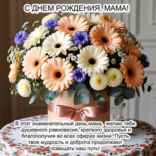 В этот знаменательный день,мама, желаю тебе душевного равновесия, крепкого здоровья и благополучия во всех сферах жизни. Пусть твоя мудрость и доброта продолжают освещать наш путь!