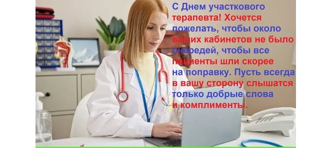Теги:с днем участкового терапевта хочется пожелать, чтобы около ваших кабинетов не было очередей, чтобы все пациенты шли скорее на поправку пусть всегда в вашу сторону слышатся только добрые слова и комплименты