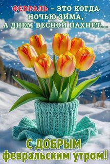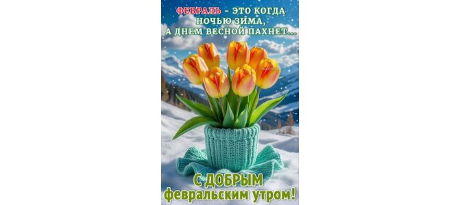 Открытка "С ДОБРЫМ ФЕВРАЛЬСКИМ УТРОМ! ФЕВРАЛЬ - ЭТО КОГДА НОЧЬЮ ЗИМА, А ДНЕМ ВЕСНОЙ ПАХНЕТ..."