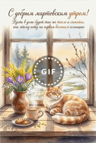 Анимированная открытка "С добрым мартовским утром! Пусть в доме будет так же тепло и спокойно, как этому коту на первом весе"