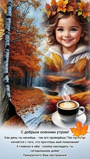 С добрым осенним утром! Как день ты начнёшь - так его проведёшь! Так пусть он начнётся с того, что прочтёшь моё пожелание! А главное в нём - сполна насладись ты сегодняшним днём! Прекрасного Вам настроения!