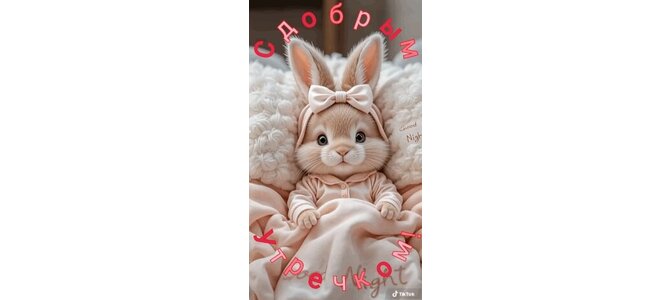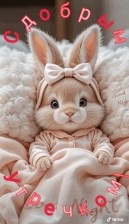В кроватке лежит маленький зайчонок, который только что проснулся. С добрым утречком!