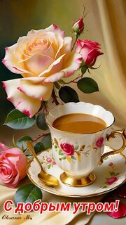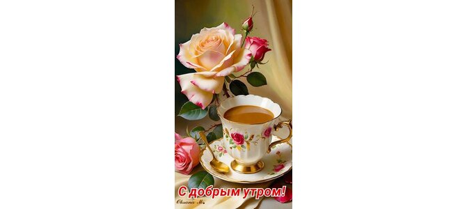 На столике стоит фарфоровая чашечка с кофе, а рядом роза. Надпись на открытке "С добрым утром!"
