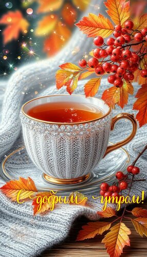 Красивая чашечка с чаем, а рядом лежит ветка рябины. Надпись на открытке "С добрым утром!"