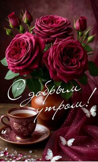 На столе стоит чашка с чаем, а рядом в вазе букет бордовых роз. Надпись на открытке "С добрым утром!"