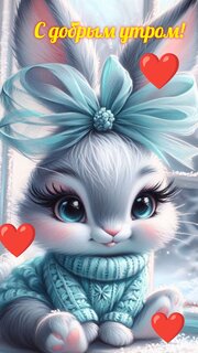 Мультяшная зайка с бантиком и синем свитерочке милости улыбается. " С добрым утром!"