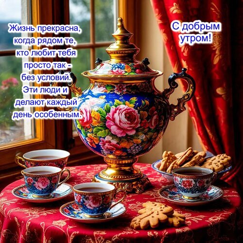 Теги:доброе утро, с добрым утром, доброго, утра, чай, пожелания, жизнь, прекрасна, мотивация, открытка, самовар, семья, любовь