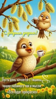 Милая и добрая поздравительная открытка с изображением двух маленьких пушистых птичек на фоне весеннего пейзажа. Одна птичка сидит на ветке с чашкой кофе или чая, а другая — на фоне залитого солнцем холма с цветущими одуванчиками. На картинке присутствуют вдохновляющие надписи на русском языке: «С добрым утром!» и пожелание, чтобы день начался с тишины, любимого чая и мысли «Всё будет прекрасно». Идеально подходит для отправки друзьям и близким в мессенджерах (WhatsApp, Telegram) для создания позитивного настроения с самого утра.
