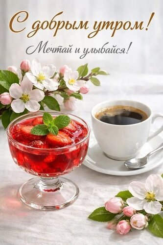 Эстетичная утренняя композиция, создающая уютное и вдохновляющее настроение. На светлом столе изображены чашка ароматного черного кофе, прозрачная ваза с ярким клубничным десертом или вареньем, украшенным листиком мяты, и нежные цветущие ветви яблони. В верхней части кадра надпись на русском языке: «С добрым утром! Мечтай и улыбайся!». Идеальное изображение для пожеланий доброго утра, сторис в соцсетях и создания позитивного настроения.