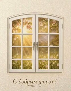 Красивая поздравительная открытка с надписью «С добрым утром!» на русском языке. На изображении представлена изящная белая арочная оконная рама с переплетами, через которую открывается вид на залитый мягким солнечным светом весенний пейзаж. За окном видны цветущие ветви деревьев, нежные цветы и золотистые лучи солнца, создающие атмосферу уюта, тепла и утреннего спокойствия. Идеально подходит для отправки близким, друзьям и коллегам для создания позитивного настроения с самого начала дня.