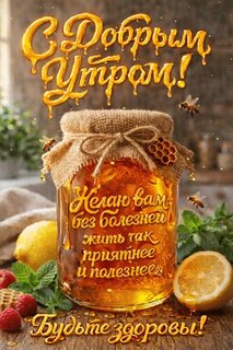 Красивая поздравительная открытка с надписью «С добрым утром!». На изображении представлен аппетитный кувшин с золотистым медом, украшенный каплями сиропа, рядом лежат свежие лимоны и ягоды малины. Текст на картинке гласит: «Желаю вам без болезней жить так приятнее и полезнее. Будьте здоровы!». Теплая, уютная атмосфера, напоминающая о здоровом завтраке и бодрости. Идеально подходит для пожелания доброго утра, здоровья и отличного настроения в мессенджерах и социальных сетях.