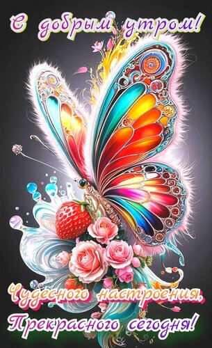 Красочная поздравительная открытка с изображением яркой, детализированной бабочки в фантазийном стиле. Крылья бабочки переливаются всеми цветами радуги: от бирюзового и золотого до насыщенного красного и оранжевого. Композиция дополнена нежными розовыми розами, спелой клубникой и каплями воды, создающими эффект свежести. На фоне — мягкое свечение и абстрактные линии. На картинке расположены вдохновляющие надписи на русском языке: «С добрым утром!» и «Чудесного настроения, Прекрасного сегодня!». Идеально подходит для отправки в мессенджерах и социальных сетях для пожелания хорошего начала дня.