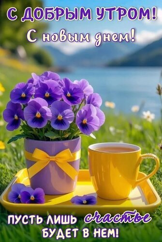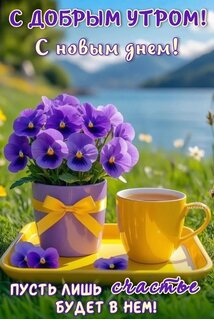 Красивая поздравительная открытка с пожеланием доброго утра и нового дня. На изображении представлен пышный букет фиолетовых анютиных глазок в красивой чашке с желтым бантом, стоящей рядом с чашкой ароматного чая на подносе. Фон — живописный утренний пейзаж с озером и горами под мягким солнечным светом. Внизу расположена вдохновляющая надпись на русском языке: «Пусть лишь счастье будет в нем!». Идеально подходит для отправки близким в мессенджерах и социальных сетях для создания позитивного настроения.