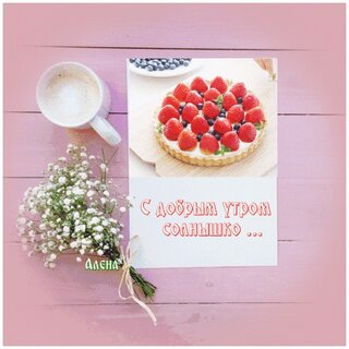 Красивая поздравительная открытка с надписью «С добрым утром, солнышко...» на нежном розовом фоне. На изображении представлен аппетитный ягодный тарт со свежей клубникой и черникой, чашка кофе и букет маленьких белых цветов (гипсофилы). Уютная и светлая композиция, идеально подходящая для отправки близким, друзьям или любимым в качестве доброго утреннего пожелания. Подойдет для соцсетей и мессенджеров.