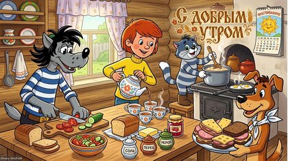 Яркая и уютная детская иллюстрация в мультяшном стиле, изображающая веселую компанию лесных зверей за завтраком. На картинке серый волк в полосатой футболке режет овощи, девочка наливает чай из расписного чайника, а милый кот помешивает кашу в кастрюле на печи. На переднем плане — аппетитный завтрак: тосты, сэндвичи, овощной салат, масло, соль, перец и джем. В углу висит календарь с надписью «С добрым утром» и солнышком. Теплая домашняя атмосфера, солнечный свет из окна и детализированная прорисовка делают изображение идеальным для детских открыток, оформления детских комнат и тематических постов.