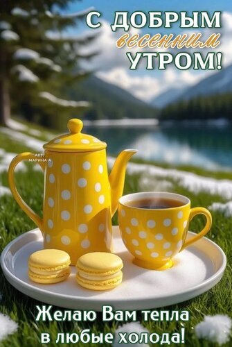 Красивая поздравительная открытка к весеннему утру. На изображении представлен уютный натюрморт: желтый чайник в белый горошек, чашка горячего напитка и два французских макаруна на белом блюде. Фон — живописный весенний пейзаж с озером, горами и заснеженными хвойными деревьями. На картинке нанесен текст на русском языке: «С добрым весенним утром! Желаю Вам тепла в любые холода!». Идеально подходит для отправки в мессенджерах и социальных сетях для создания уютного настроения и пожелания доброго утра близким и друзьям.