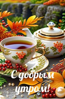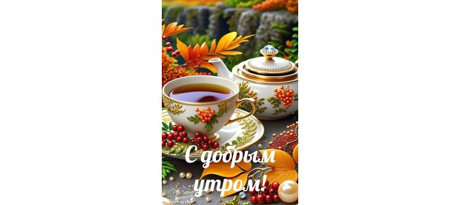 На столе стоят красивые заварной чайник и чашка с чаем и вокруг лежат листья рябины. На картинке надпись "С добрым утром!"