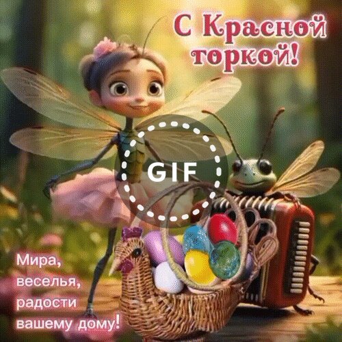 Милая и праздничная открытка к празднику Красная горка. На изображении очаровательная лесная фея в розовой пачке с крыльями стрекозы и забавный кузнечик, играющий на гармошке. Перед ними стоит плетеная корзинка, наполненная разноцветными пасхальными яйцами. Теплый солнечный свет пробивается сквозь лесную чащу, создавая сказочную атмосферу. В тексте на русском языке: «С Красной горкой! Мира, веселья, радости вашему дому!». Идеально подходит для поздравления близких и друзей с этим светлым праздником.