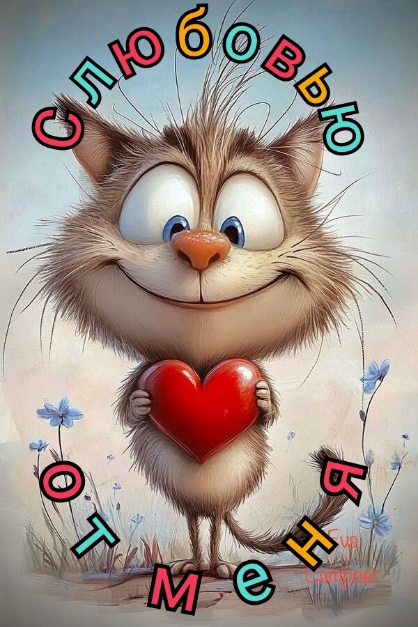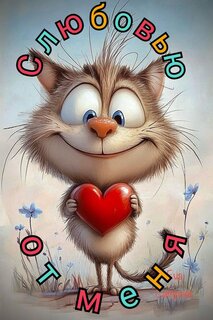 Улыбающийся кот держит в лапах сердечко. Надпись на открытке "С любовью от меня."